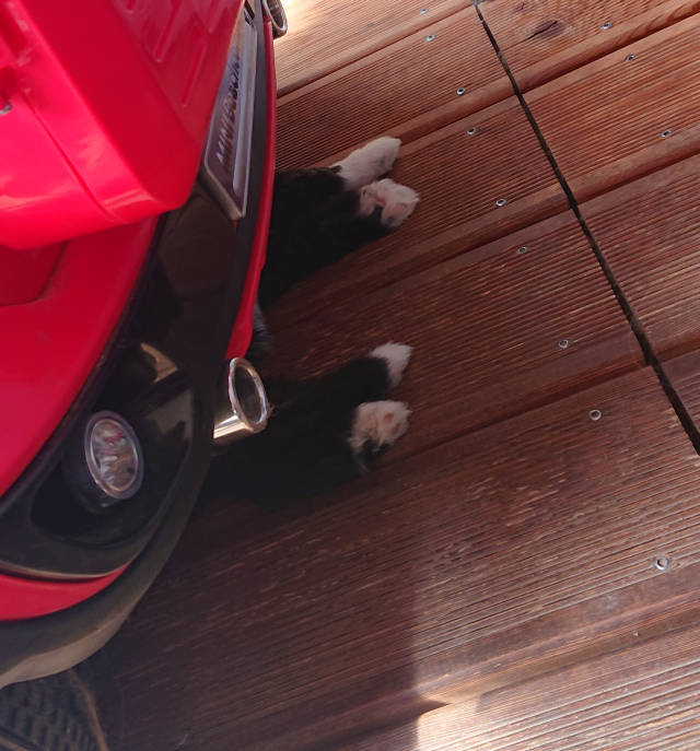 Die Bärchen waren auf der Terrasse...teils spielend, teils schlafend. Es kann doch nicht sein, Bolle war einfach nicht zu sehen. Doch plötzlich hörte man ein leises Schnarchen. Er war unters Auto gekommen *smile* und schlief dort tief und fest. Unter einm Spielzeugauto natürlich. |